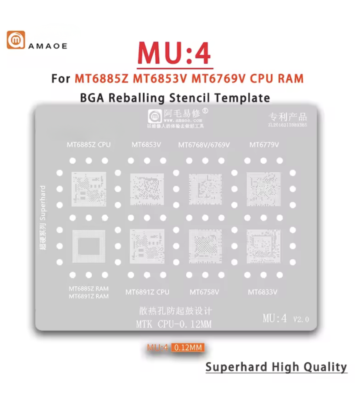 The Amaoe MU4 BGA Reballing Stencil is a precision-engineered tool designed for MTK CPU and RAM reballing and chip-level repair. Compatible with MT6768V, MT6758V, MT6891Z, and MT6779V chipsets, it ensures perfect solder ball alignment and smooth tin application. Made from high-quality, heat-resistant stainless steel, ideal for professional IC and motherboard rework.