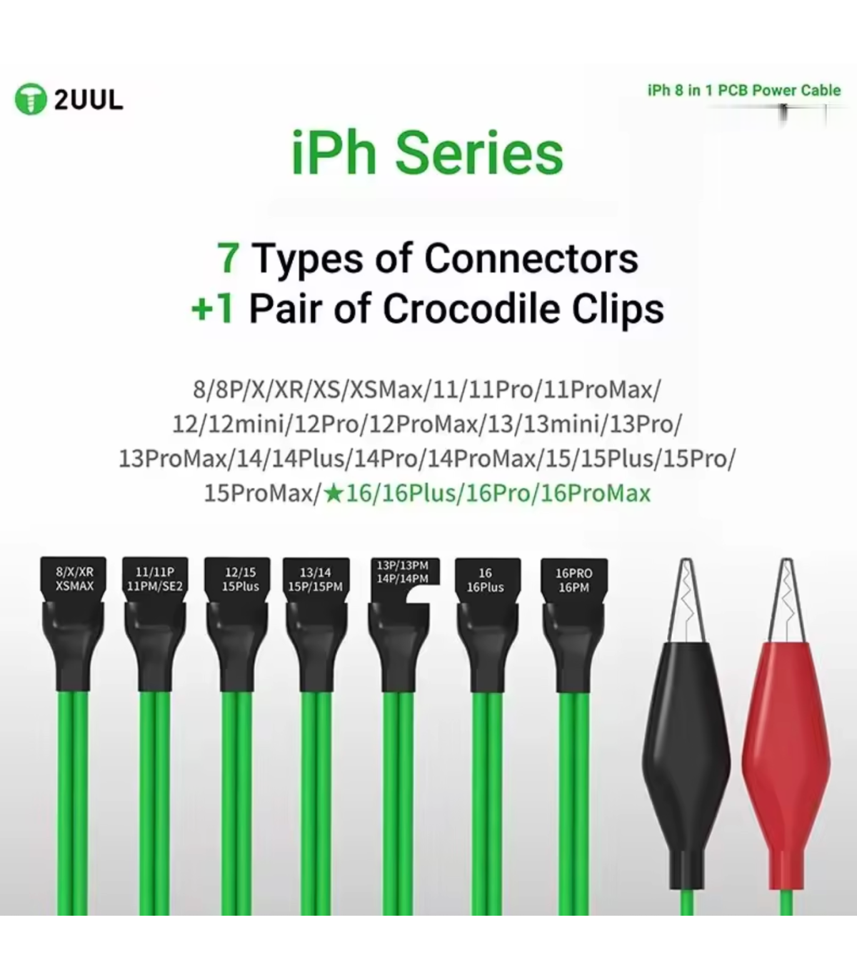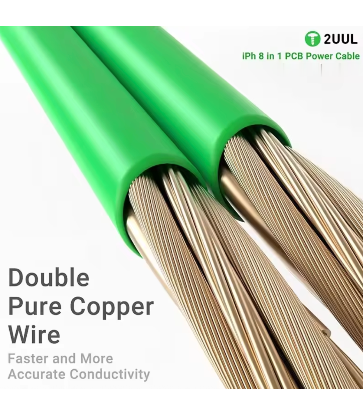 The 2UUL PW05 Boot Test Cable is a professional-grade DC power supply cable designed for powering and testing iPhone 8 to iPhone 16 series logic boards. It connects directly to a DC bench power supply, allowing technicians to diagnose power issues, perform boot tests, and repair logic boards safely and efficiently.